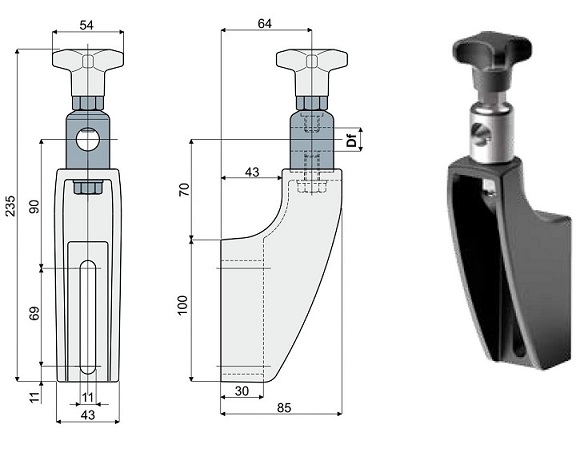 Materiał: Wspornik i pokrętło ze wzmocnionego poliamidu, kolor czarny. Sześciokątna wkładka z mosiądzu niklowanego. Głowica, śruba, nakrętka i podkładka ze stali nierdzewnej AISI 304.